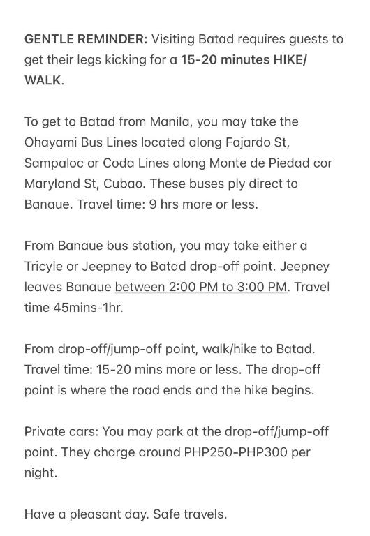 Upon reaching Banaue, you can easily hire a local jeepney or tricycle to take you to Hillside Inn and Restaurant in Batad. The journey from Banaue to Batad takes approximately 30-45 minutes, depending on the weather conditions. As you traverse the winding mountain roads, you'll be mesmerized by the terraced rice fields and the untouched beauty of the region.